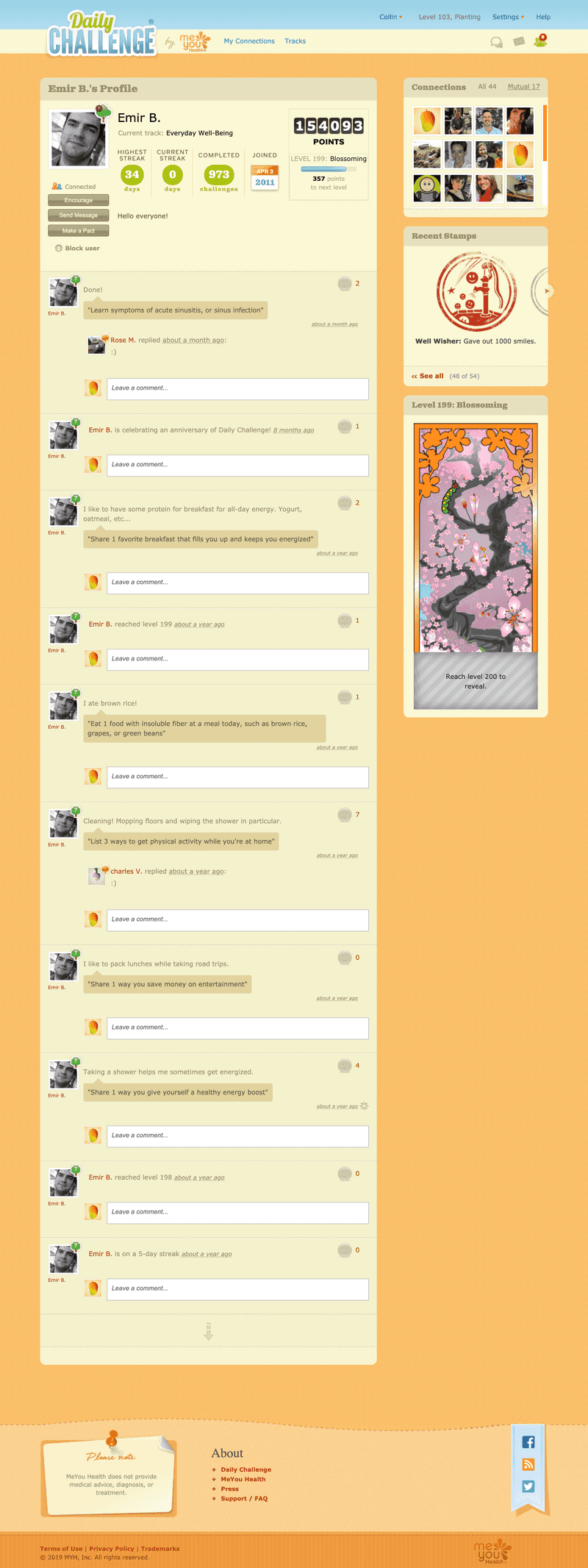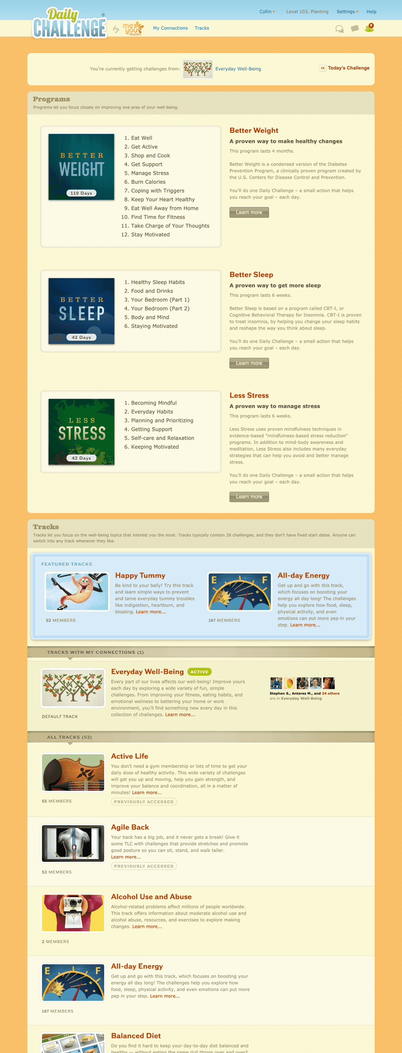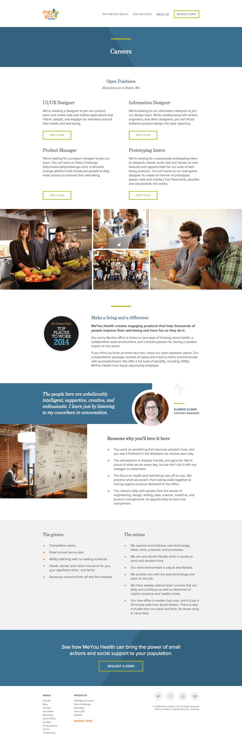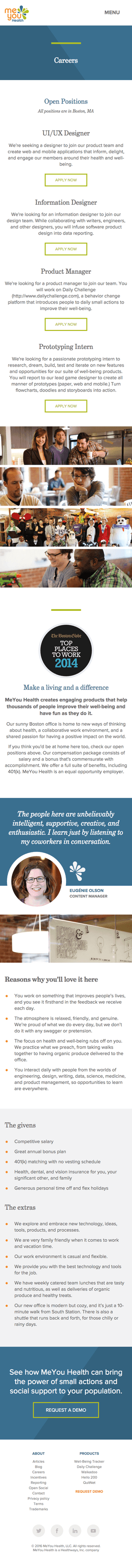 - Involved in nearly all MeYou Health products, including, but not limited to: Daily Challenge, Walkadoo, Quitnet, Well-Being Tracker, Snap, and others