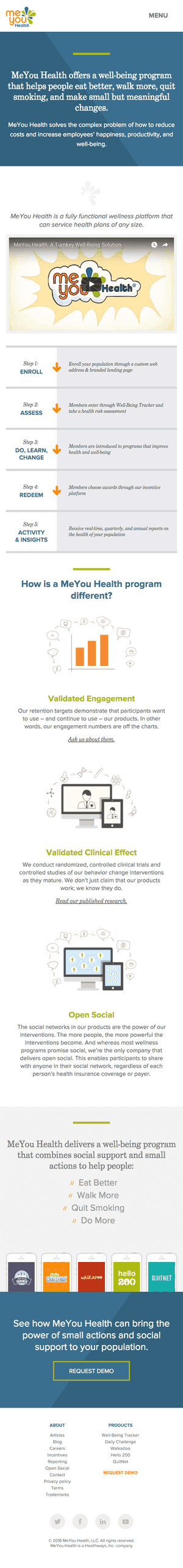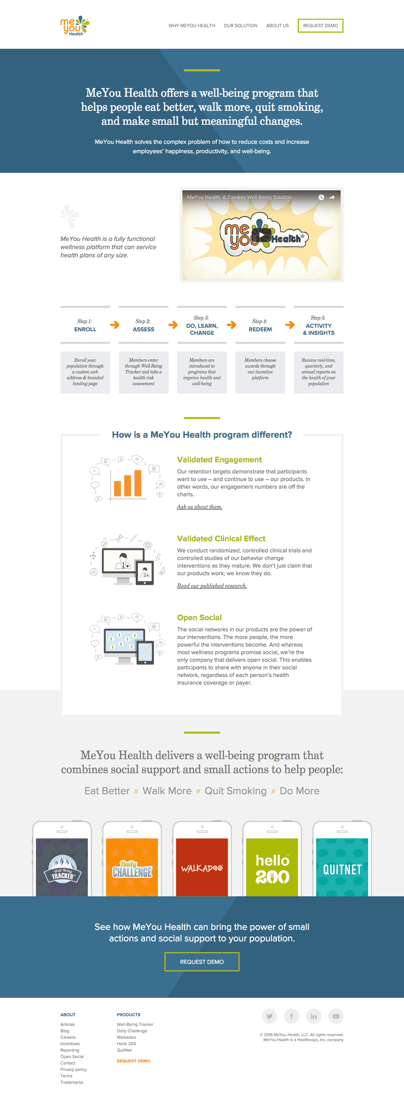 MeYou Health was a well-being company, founded in 2009, with the goal of modernizing traditional health and wellness programs through new and innovative approaches. We created digital and social well-being products that encompassed both the individual and the broader community they lived in. It grew into a platform, showcasing products that achieved sustained engagement and measurable, clinically demonstrated impact.